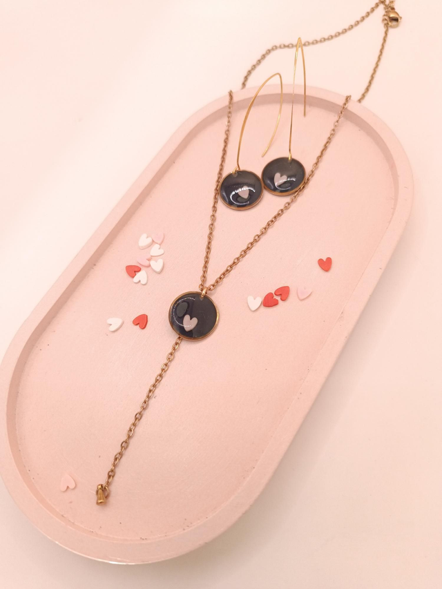 Matières : résine époxy et acier inoxydable. Petits cœurs roses pâles sur fond bleu nuit.